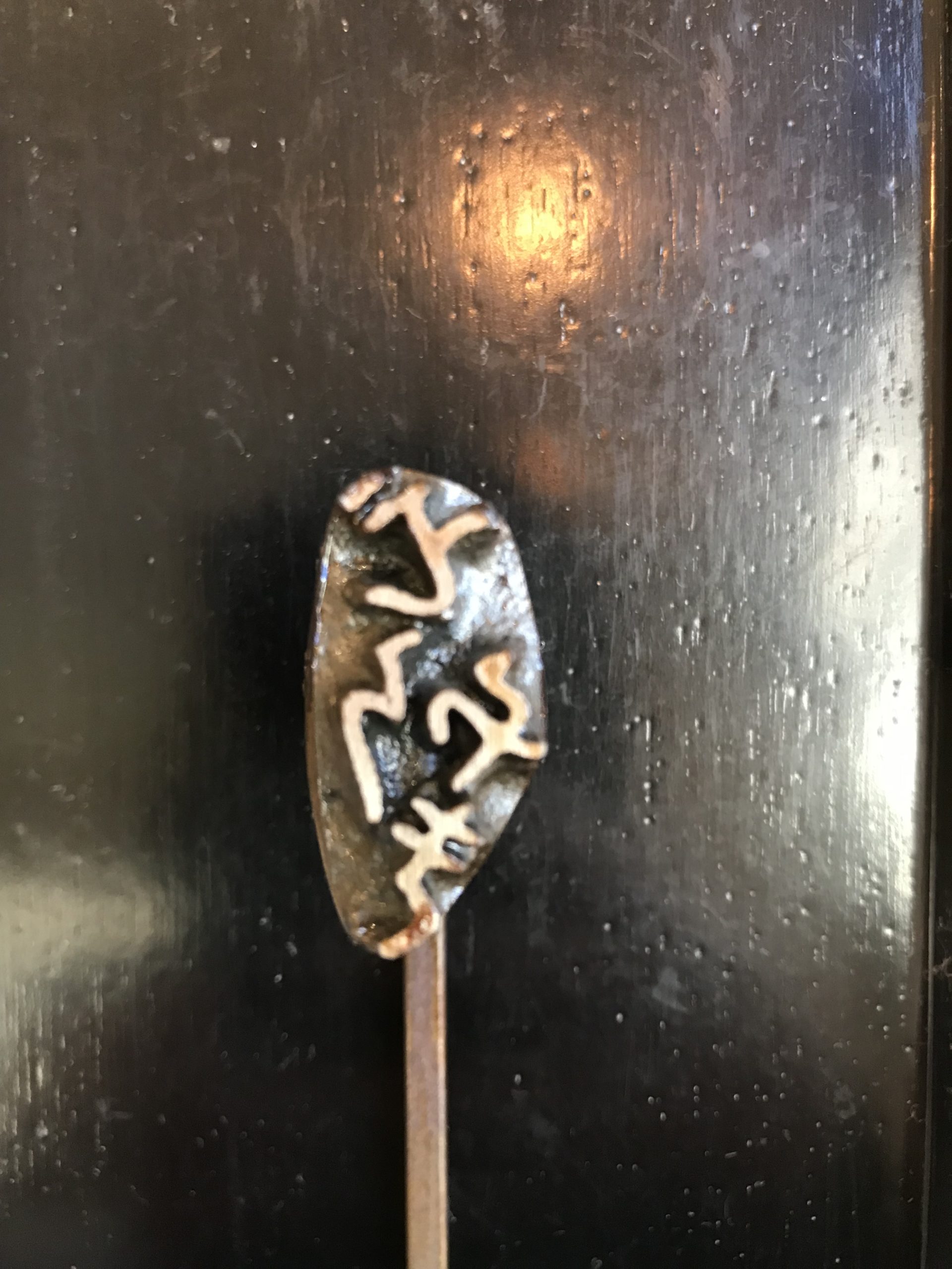Tampon YAKIIN. Il suffit de le chauffer sur le feu puis de le tamponner pour réaliser le mot « dorayaki » en japonais (どらやき) sur un Dorayaki, un Tamagoyaki, ou encore du pain de mie.
